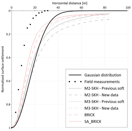 Finally, the vertical movements, normalized by the maximum settlement of the individual analysis for the east tube are shown in Figure 17 together with the Gaussian distribution and the normalised settlement measured on the site. In this case, all the predictions give narrower settlement troughs than the Gaussian distribution as they include the superposition of the excavation of both tubes, while the Gaussian curve can account for one tube only. Again, it can be observed that the SA_BRICK model best predicts the narrowest settlement trough in this case, followed by the BRICK model.