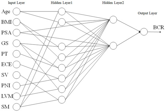 BCR prediction is necessary for successful PCa treatment [5]. Many studies have been conducted on the prediction of BCR, and research on prediction methods using machine learning (ML) technology is currently in progress. Prediction using ML has been reported to be excellent for diagnosis [6,7,8,9,10]. At present, the healthcare field is attempting to apply digital twins, and ML can be viewed as a technology for implementing digital twins [11,12,13,14,15]. Among the ML technologies, the most widely used, i.e., neural network (NN), can contribute to BCR prediction. The NN is good at analyzing data without domain knowledge of the BCR. Furthermore, an NN can analyze complex data to discover new patterns and information relating to BCR [16,17,18,19]. However, the “black box” characteristic of NN does not indicate the importance of learning variables [20,21,22]. eXplainable artificial intelligence (XAI) is a method for determining the internal calculation process after learning [23,24]. However, XAI does not know the correlations between variables before learning. Moreover, NN architectures with many connections between unnecessary nodes reduce the learning costs and performance. Therefore, an NN technique that can reduce the costs and improve the accuracy based on a few variables is required. Several optimizations are available, and we use a pruning NN to improve the architecture [25,26].