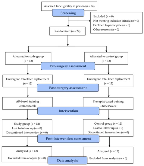 This study was a double-blind randomized controlled trial with a repeated-measures design comparing the effect of augmented-reality-based training with conventional therapist-based training on patients with TKR. Participants were blinded and randomly assigned to either the augmented-reality-based training (ART) group or the therapist-based training (TBT) group. Outcome measurements were conducted by a blinded registered physiotherapist pre-surgery, post-surgery, and post-intervention. The study procedure was conducted in accordance with the principles of the Declaration of Helsinki and the protocol received ethical approval from the Research Ethical Committee of CM Hospital (ethical approval number: CMHCTC-19-002). All the participants provided written consent prior to being enrolled in the study.