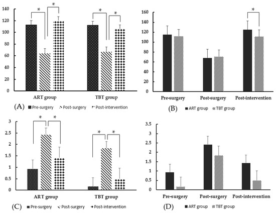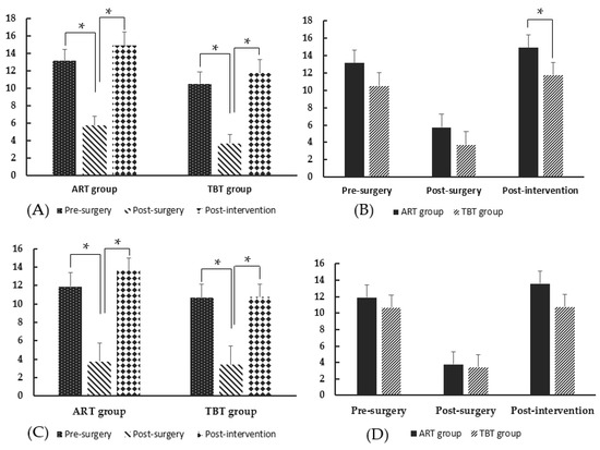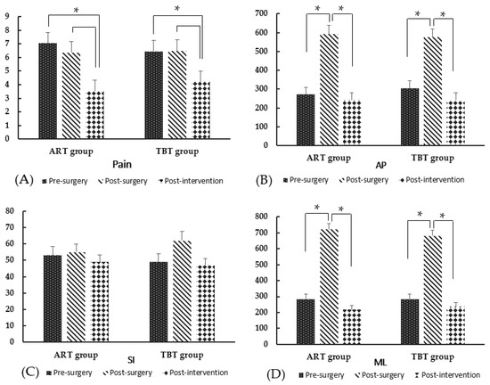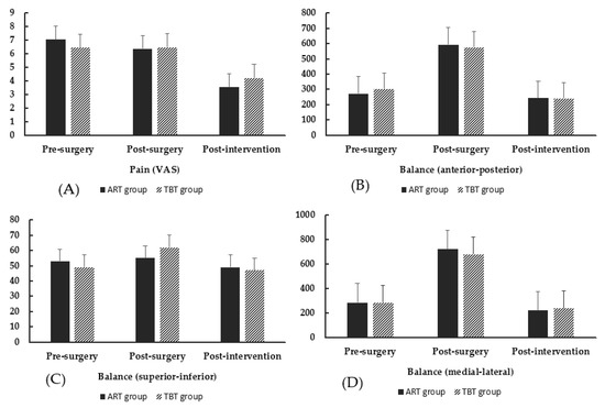 Regarding the balance score, the within-group comparison showed similar results in both groups (Table 4, Figure 5 and Figure 6). Significant differences were observed between the pre-surgery and post-surgery and between the post-surgery and post-intervention in AP and ML movements (p < 0.05). The SI movement did not present any significant difference in all measurement times within both groups. The between-group comparison did not show any significant difference between the ART and TBT groups during the Mann–Whitney U test (p > 0.05).