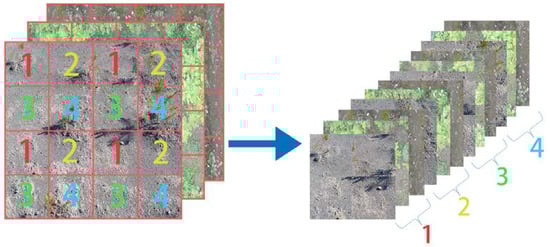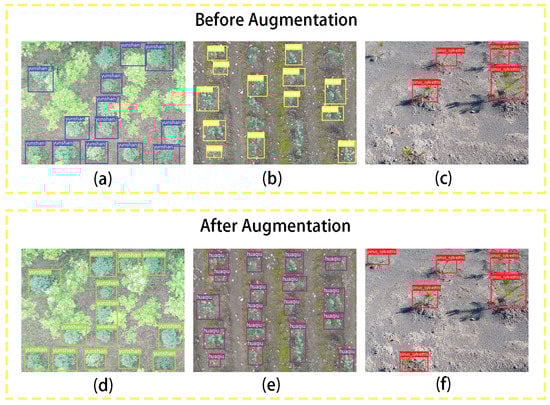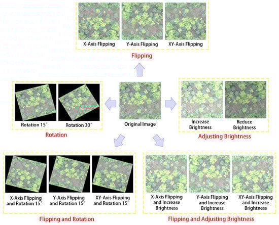 Data augmentation is a technique of increasing the limited data to be significant, meaningful, and more diverse. Data augmentation prevents overfitting and improves the accuracy of the detection model []. To further enhance the model’s performance, it is necessary to use data augmentation methods to expand the sapling dataset. Referring to related literature work, the data in this study were augmented via 13 strategies of the major data augmentation methods, such as flipping, rotating, flipping and rotating at the same time, adjusting brightness, and flipping and adjusting brightness at the same time. Examples of the applied data augmentation are shown in Figure 4. The data augmentation process was applied after the data labeling process. Thus, images were augmented simultaneously with the label files. Therefore, the dataset was divided into two datasets in the ratio of (8:2): the training dataset and the validation dataset. The augmented training dataset contained 7000 images, and the augmented validation dataset contained 2000 images.