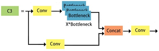 The model backbone of YOLOv5s is mainly used to extract essential features of the input image. It primarily consists of a focus module (Focus), standard convolution module (Conv), cross stage partial network module (C3), and spatial pyramid pooling module (SPP). The input RGB image is divided into four parts and concatenated by the focus module for better extracting the features during down-sampling. Then, the four parts of data are spliced in the channel dimension by the Concat module and then convolved to obtain the down-sampling feature map. The focus module increases the channel dimension and reduces the width and height of the feature map, improving the network’s performance by lowering FLOPS (floating point operations per second) and increasing speed. Figure 6 shows the slicing operation of the Focus module. The Conv is the basic convolution module of YOLOv5s that performs convolution operation, normalization, and activation operations for feature extraction. The C3 module is a designed module based on cross stage partial network, which is used to enhance the gradient values of backpropagation between layers and improve the learning ability of the model. Figure 7 shows the structure of the C3 module. The SPP module improves the receptive field of the network by converting the arbitrary feature map into a fixed-size feature vector. It mixes and pools spatial features through three parallel max pooling layers and then concatenates them []. Figure 8 shows the structure of the SSP module.