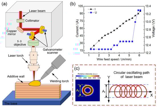 The additive manufacturing system mainly consists of a Fanuc M-710ic industrial robot, Fronius TPS4000 CMT welder, IPG YLS-6000 fiber laser, and a SCANLAB HurrySCAN30 galvanometer. Figure 1a shows the schematic diagram of the oscillating laser-arc hybrid additive manufacturing system. Among them, as shown in Figure 1b, the arc parameters are controlled in a one-dimensional control mode. The current and voltage are automatically matched according to the wire feeding speed, and the CMT arc has a very low heat input, which helps stabilize the additive manufacturing process [22,23]. The oscillation of the laser beam is achieved using the galvanometer. By controlling the motion of the two galvanometers, different oscillation modes can be realized, such as transverse, longitudinal, and circular. A circular pattern was more beneficial for stabilizing the melt pool based on the previous results [24]; therefore, the circular oscillation with a radius of 0.3 mm was used, as shown in Figure 1c. It should be noted that the relationship between the oscillation frequency f (Hz) and the oscillation speed Vf (mm/s) can be expressed by Equation (1).