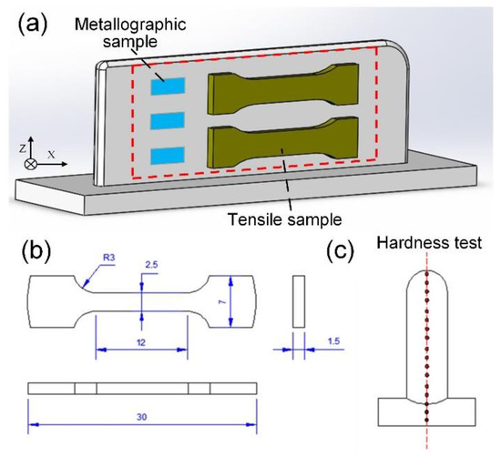(a) The position of metallographic and tensile samples; (b) the dimension of tensile test specimens; (c) the position of the hardness test.