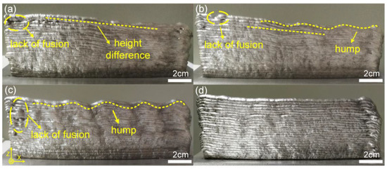 As shown in Figure 3, all of the thin-walled components had some degree of macroscopic defects, such as lack of fusion, hump, and height difference. Due to the low temperature at the arc start, it was difficult for the magnesium alloy to wet and spread, and a lack of fusion usually formed at the head of the component. As the deposition proceeded, heat accumulated in the component, the melt pool spread outward at the closing arc position, and the formed deposition layer collapsed. Therefore, as the deposited layers were stacked, the height difference between the head and the end of the component was formed. Interestingly, as shown in Figure 3a–c, the height difference defect gradually turned into a wavy hump as the oscillation frequency increased from 0 Hz to 200 Hz. Significantly, as shown in Figure 3d, the component at 300 Hz had good macroscopic properties with no collapse, good interlayer fusion, and uniform layer heights, and various macroscopic defects were effectively suppressed. The mechanism of hump defect suppression using beam oscillation is discussed in detail in later sections.