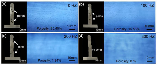 The longitudinal cross-section and transverse X-ray NDT of the thin-walled components are presented in Figure 4. By observing the longitudinal cross-section, it can be found that as the oscillation frequency increases from 0 Hz to 300 Hz, the size and number of pores decrease significantly. By comparing the NDT results, as shown in Figure 4a, it is observed that a large number of chain-like pores are uniformly and densely distributed in each deposited layer of the component without beam oscillation. As shown in Figure 4d, when the oscillation frequency is 300 Hz, there are no pores found in either the cross-section or the NDT results.