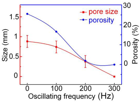 The average pore size and porosity of the thin-walled components are calculated in Figure 5. It can be found that there is a significant negative correlation between the size and number of pores and the beam oscillation frequency. As the beam oscillation frequency increases from 0 Hz to 300 Hz, the porosity decreases from 25.45% to 0%, and the average size decreases from 1.8 mm to 0 mm. The mechanism by which laser oscillation can reduce porosity is discussed later.