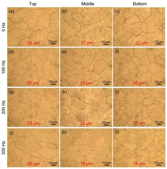 OM grain size of the AZ31 alloy at various positions from 0 Hz to 300 Hz. (a–c) 0 Hz; (d–f) 100 Hz; (g–i) 200 Hz; (j–l) 300 Hz.