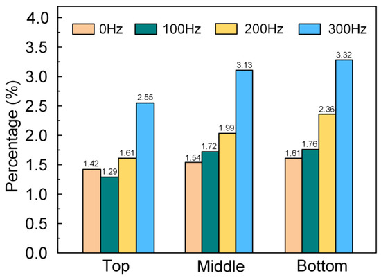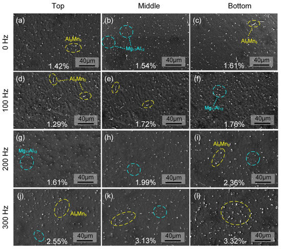 As shown in Figure 9, the granular precipitated phases in Figure 7 were counted. It can be seen that for the same component, the proportion of precipitates gradually decreases from the bottom to the top. Further, at the same position, the proportion of precipitates gradually increases with the increase in frequency. For example, as the frequency increases from 0 Hz to 300 Hz, the precipitate content increases from 1.42–1.61% to 2.55–3.32%.