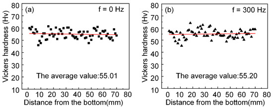 Distribution of hardness values along the height direction for the component. (a) 0 Hz; (b) 300 Hz.