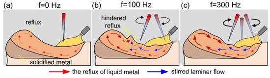 where ρ is the density of the melt pool, μ is the viscosity of the melt pool, f is the oscillating frequency, and r is the oscillating radius. For the magnesium alloy melt pool, the density ρ is 1.59 g/cm3, and the viscosity μ is 1.2 × 10−3 Pa·s [28]. The stirring theory indicates that the laminar flow shifts to turbulent flow in the molten pool when Re is higher than 103. In this experiment, the oscillating behavior could produce a stable stirred laminar flow in the molten pool (shown by the blue arrows in Figure 13) because the calculated Re = 143 is much smaller than the limit of turbulence generation.