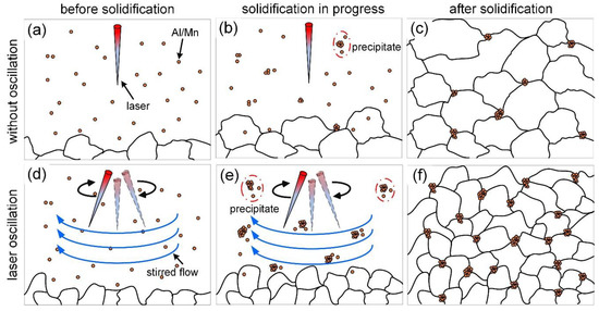 Schematic diagram of microstructure evolution induced using oscillating laser. (a–c) without oscillation; (d–f) laser oscillation.
