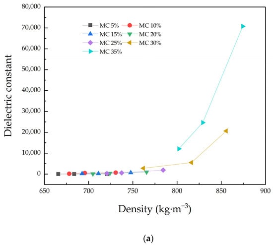 Under the condition that the sample density was level II, the dielectric constant and the loss factor of the samples were examined at a measurement frequency of 10 kHz under various moisture contents (5–35%). The results are displayed in Figure 6.