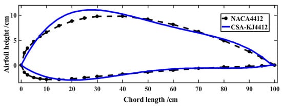 To test the effectiveness of the CSA-KJ airfoil optimization method, we optimize the zero angle of attack of the NACA4412 airfoil in this work, and the parameters are set as follows: is the upper limit of optimization iteration, is the target lift, is the incoming flow velocity, is the angle of attack, is the fluid density, and is the radius of the flow tube. The CSA-KJ4412 airfoil is obtained through an iterative calculation process using the CSA-KJ method. As shown in Figure 2, the shape of the airfoil before and after treatment is displayed. It is evident that the profile of the CSA-KJ4412 airfoil exhibits good smoothness, indicating that the airfoil profile is effectively described by a fourth-order constant-free polynomial function.