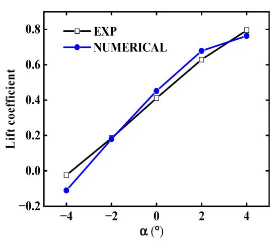 In order to confirm the validity of the numerical calculation, the NACA4412 airfoil was taken as an example to compare the numerical calculation results by CFD with the experimental data [31]. The lift coefficient of the NACA4412 airfoil at a Reynolds number of in the steady state, is shown in Figure 4. In terms of the lift coefficient, the curve trend obtained by numerical calculation is consistent with the experimental data, and the numerical calculation results are closer to the experimental value; especially if the angle of attack is −2°. In general, the results show that the numerical calculation results by CFD are accurate and agree well with the experimental data. The following numerical calculations for the airfoil in this study were performed using the same method mentioned above.