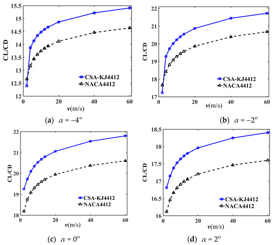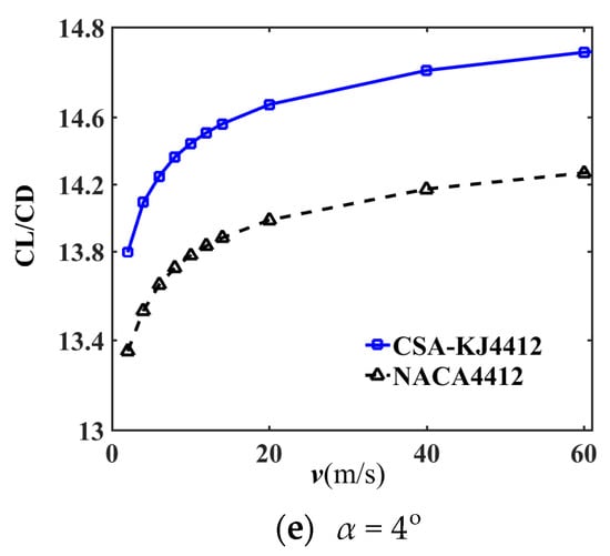 To observe the aerodynamic characteristics of the CSA-KJ4412 airfoil in the range of small angle of attack , the CL divided by the drag coefficient (CD) is defined as the lift-drag ratio coefficient (CL/CD), and when is −4°, −2°, 0°, 2° and 4°, respectively. The corresponding variation curves with incoming wind speed are drawn in Figure 6a–e.