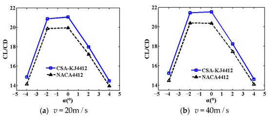 To more easily observe the change in the airfoil lift-drag ratio with a more intuitive angle of attack, the comparison curves under different incoming wind speeds are displayed in Figure 7a–c. It is clear that the CL/CD of CSA-KJ4412 at different angles of attack is higher than that of NACA4412 when the incoming wind speed is constant. In the range of the angle of attack of to , the CL/CD of the two airfoils initially increases before decreasing with ascending angles of attack. It then reaches a maximum when the angle of attack is or , and the lift-drag ratio of CSA-KJ4412 at a different angle of attack s is higher than that of NACA4412.
