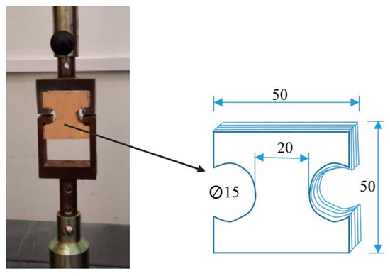 The longitudinal to grain tension strength experiment was carried out on a universal test machine, a BTI-FB 050 TN (Zwick), using curved edge grippers in which a specimen was affixed (Figure 4). This is a nonstandard test to find out the “weakest point” of the LVL under such a load (the tensile load is not applied across the fiber, but along it, a kind of “shear”). As a standard, the specimen is pulled perpendicular (across) the fiber. It is known that in this case of natural wood, the resistance perpendicular (across) the fiber is about 20 times lower than (longitudinal) along it [1,33]. The clamp speed was 100 mm per minute, while the load was measured using a 5 kN load sensor. Seven specimens with a dimension of 50 × 50 mm were prepared for the tension strength experiment. The drilling was carried out using an electric low speed drill to prevent the formation of additional cracks around the edges of the holes (Figure 4).