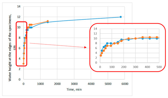 After the specimen was immersed, the water rose along all of the bonded elements, at the edges of the LVL panel, with water ingress sometimes occurring at a lower point in the sample and sometimes higher, but in all elements the water actually rose during the first few minutes of the test. Analysis of the water rise levels inside the specimen revealed slightly different results (Figure 6).