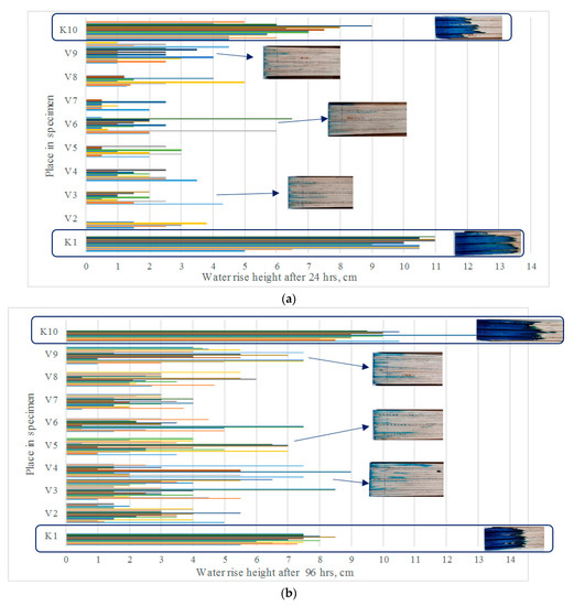 In order to evaluate the final water rise height, not only along the edges of the specimen but also inside the specimen, each specimen had to be cut lengthwise and the water rise height was measured in the bonded elements of the LVL panels after a period of 24 h and again after a period of 96 h, by immersing the specimens in water at a depth of 2 cm. Irrespective of the length of time, water at the edges of the specimen was found to have risen higher than it did inside the sample (Figure 6). Not all elements of the LVL bonded panel absorbed water within the same period of time on the inside of the LVL panel. For some elements, the water rise was not detected after twenty-four hours of soaking (Figure 6a). When evaluating those specimens that had been soaked for 96 h, it was found that although the water did tend to rise to insignificant levels, the rise height differed slightly after 24 h and after 96 h, and yet it was found that after 96 h most of the bonded elements had absorbed water and that water had crept upwards along the element (Figure 6b). When an assortment of wood with a moisture content below the fiber saturation limit is immersed end in a liquid, the liquid rises up under the action of capillary pressure. The macrocapillaries fill first with liquid, followed by microcapillaries. The air removed from the capillaries opposes the movement of the liquid. The liquid stops rising when the capillary pressure equals the force of the liquid’s weight. In the case of LVL, the regularities are likely to be slightly different, as both the properties and fiber orientation of each layer may differ.