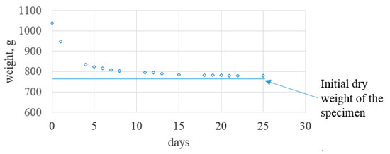 The results show that the water absorption of the samples changed by an average of 34% during soaking. The results of a weight loss over time (standard deviation between 7–11%) are shown in Figure 7. It can be seen that the drying process under which the specimen were soaked during the subsequent four days was rapid: on average, the levels of water soaking tended to decrease, from 34–20% each day, with the full four-day decrease bringing the level down to 8%. After a full twenty-five days, the change in weight of the soaked samples did not exceed 1% when compared to the initial changes.
