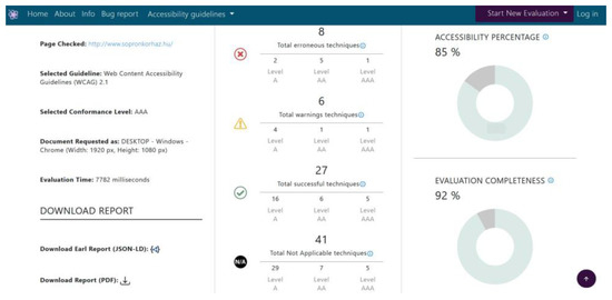 TAW is another open-source accessibility evaluation framework that allows the evaluation of a website’s accessibility status without charging costs. It generates an evaluation report that mentions the total number of issues on the web page that are related to accessibility aspects in terms of the number of “Passed”, “Failed”, “Not Tested”, and “Not Decided” success criteria [33]. Figure 2 shows the accessibility-evaluation result of the SOPRONI Gyogykozpont website via TAW, in terms of their assessment terminologies.