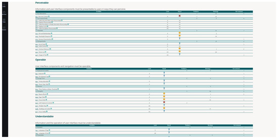 Mauve++ is an open-source accessibility-evaluation environment that allows users to test a particular website through their URLs [33]. It validates websites against the Web Content Accessibility Guidelines (WCAG), providing various platforms (such as desktop, iPad, mobile phone, and tablet) to conduct the evaluation process. It evaluates websites against various checkpoints of the WCAG and classifies the evaluation report in terms of “Passed”, “Failed”, “Not Tested”, and “Not Decided” evaluation matrices. Figure 1 shows the accessibility-evaluation result of the SOPRONI Gyogykozpont website via Mauve++, which shows the evaluation result in terms of four assessment terminologies. The details of the Mauve++ tool can be found in [34].