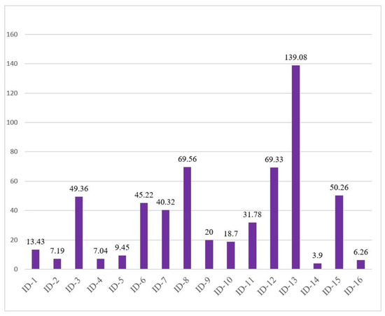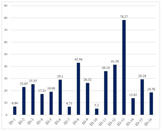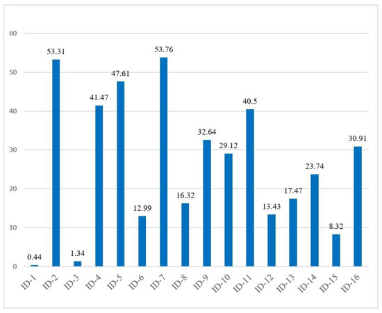 To compute the integrated accessibility score, first, the accessibility scores were computed by incorporating Mauve ρ(Mauve) via the ComputeAccessibility.Mauve process (Algorithm 1). The computed results of 16 healthcare institutions’ web pages are shown in Table 3. As a visual illustration of the computed accessibility score, Figure 3 shows a bar graph, with the corresponding website ID as a reference.
