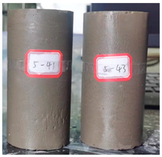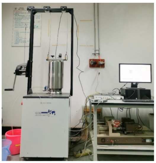 In total, three groups of tests for cemented soil with different cement content were conducted. The cement content of the cemented soil mixture was 6%, 12%, and 18%, respectively. According to the local specification [19], the consolidation and drainage process of cemented soil was not considered because of its poor permeability. Hence, the unconsolidated-undrained triaxial tests of the cemented soil were conducted in this study. The confining pressure for the unconsolidated-undrained triaxial tests were set at 100 kPa, 200 kPa, 400 kPa, 800 kPa, and 1600 kPa, respectively. The UCS and triaxial shear tests were all conducted in the GDS shear test apparatus, which could provide a maximum confining pressure of 5 MPa. The pictures of test specimens and the shear test apparatus were presented in Figure 1 and Figure 2, respectively. The specimens were saturated by vacuum saturation and the B value was greater than 0.9 by applying back pressure before the shear tests. For some hard clays with poor permeability, the specimen could be considered to reach the relative saturation state under this condition [20]. The loading rate was controlled at 0.5 mm/min, and tests were terminated when the axial strain reached 15%.
