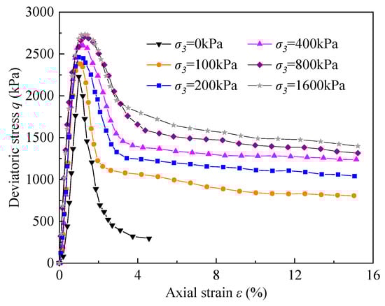 The stress–strain curves of the cemented soil with 18% cement content after being cured for 28 days are shown in Figure 3, where ε is the axial strain, q is the deviatoric stress and σ3 is the confining pressure. As shown in Figure 3, the stress–strain curves of cemented soil under different confining pressures all showed softening behavior, and the stress–strain curve could be divided into three stages. In the first stage, the deviatoric stress initially grew linearly with strain; in the second stage, the deviatoric stress exhibited elastic–plastic characteristics when approaching the peak strength, and the brittle failure then occurred; in the third stage, the deviatoric stress almost remained stable as the strain kept increasing. Furthermore, the deviatoric stress of the cemented soil increased with the confining pressure in the first stage, while the growth rate decreased with confining pressure. The maximum deviatoric stress increased from 2353 kPa to 2605 kPa when the confining pressure increased from 0 to 400 kPa. The maximum deviatoric stress increased from 2605 kPa to 2738 kPa when the confining pressure increased from 400 kPa to 1600 kPa. Moreover, Figure 3 also indicates that the residual strength of deviatoric stress also increased with confining pressure.