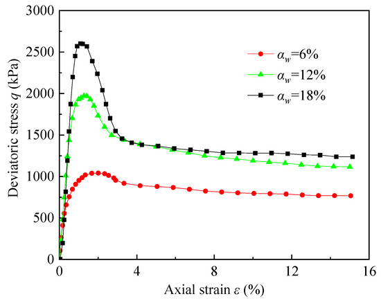 The stress–strain curves of cemented soil with different cement content are shown in Figure 4. The specimens were all under a 400 kPa confining pressure after being cured for 28 days. According to Figure 4, the cement content had a great impact on the peak strength of the cemented soil. The maximum deviatoric stress was 1047 kPa when the cement content was 6%, and the maximum deviatoric stress increased to 1977 kPa when the cement content was 12%. The maximum deviatoric stress finally increased to 2633 kPa when the cement content was 18%. Moreover, the softening feature also increased with the cemented soil strength. The residual deviatoric stress of cemented soil with 6% cement content was 774 kPa when the axial strain reached 15%, and the value of the residual/peak deviatoric stress was 0.74. The value of the residual deviatoric stress was 1110 kPa, and the value of residual/peak deviatoric stress decreased to 0.56 when the cement content of the cemented soil was 12%. The residual deviatoric stress was 1243 kPa, and the value of the residual/peak deviatoric stress was only 0.47 when the cement content of the cemented soil was 18%.