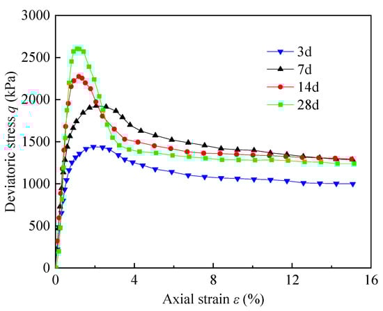 The stress–strain curves of the cemented soil under 400 kPa confining pressure when the cement content was 18% are presented in Figure 5. As shown in Figure 5, the cemented soil strength increased with curing time. The maximum deviatoric stresses were 1440 kPa, 1929 kPa, 2284 kPa, and 2605 kPa, respectively, when the curing time was 3, 7, 14, and 28 days. Moreover, the softening feature of the cemented soil was more obvious with the increase in its strength. The values of the residual/peak deviatoric stress were 0.69, 0.67, 0.57 and 0.47, respectively, as the curing time increased from 3 to 28 days.
