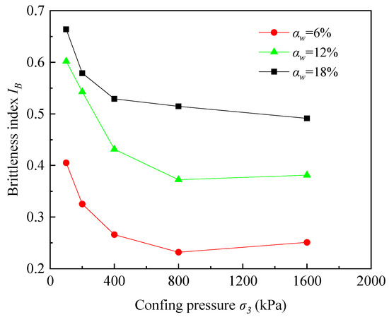 The variation in the brittleness index of the cemented soil with confining pressure is presented in Figure 6. The cemented soil specimens were all cured for 28 days.