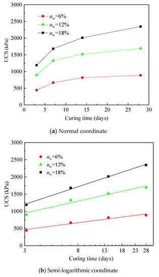The UCS tests were carried out after the cemented soil specimens were cured to the planned time. The test results of the specimens with different cement content and different curing times are shown in Table 3. The influence of curing time on the UCS of cemented soil is shown in Figure 7. As shown in Figure 7a, the strength of the cemented soil with different cement content all increased with curing time. Nevertheless, the growth rate gradually slowed down as the curing time increased. For the cemented soil specimen with 12% cement content, the UCS increased from 900 kPa to 1330 kPa when the curing time increased from 3 to 7 days, and the strength increased by 32.3%. The UCS increased from 1330 kPa to 1694 kPa when the curing time increased from 7 to 28 days, and the strength increased by 27.3%. As shown in Figure 7b, the UCS of cemented soil with a different cemented content had an approximate linear correlation with curing time under the semi-logarithmic coordinate.