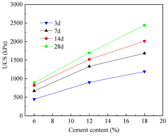 The correlation between the UCS of the cemented soil and cement content is presented in Figure 8. This figure indicates that there was a linear correlation between the UCS and cement content. Figure 8 also shows that when the curing time was 7 days, the UCS of the cemented soil with 12% cement content increased by 98.8% compared with that of the cemented soil with 6% cement content, and the UCS of the cemented soil with 18% cement content was 26.5% higher than that of cemented soil with 12% cement content.