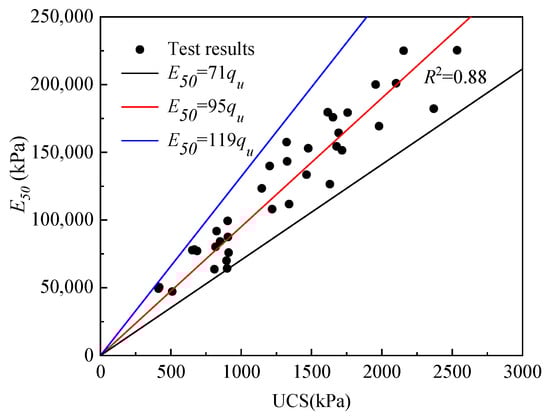 The correlation between the deformation modulus and UCS of cemented soil is shown in Figure 9. The deformation modulus E50 is the ratio of the 50% peak strength of cemented soil to the corresponding strain. Figure 9 shows that when the cemented soil strength was in range of 447–2353 kPa, the corresponding deformation modulus was in the range 47.2–225.3 MPa. The ratio of the deformation modulus E50 and cemented soil strength qu was in the range 71–119. The local specification suggests that the ratio of the deformation modulus E50 and the cemented soil strength E50 was in the range 100–120. It could be considered that the test result in this study was close to the proposed values of the local specification [22]. Moreover, the recommended value of E50/qu was 95 according to the experimental results.
