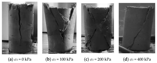 The photographs of typical failure modes of the cemented soil specimens are presented in Figure 10. The specimens had a cement content of 18% and were cured for 28 days. The confining pressures were 0 kPa, 100 kPa, 200 kPa, and 400 kPa, respectively. As shown in Figure 10, four typical failure modes occurred in this study. In the UCS tests (the confining pressure was 0), the vertical crack occurred in the cemented soil specimen, as shown in Figure 10a. It can be considered that the tension failure occurred in the UCS tests. The photograph of the cemented soil specimen under the confining pressure of 100 kPa after the test is shown in Figure 10b. The failure mode was between the tension failure and shear failure, which was similar to the test results of Sariosseiri [21]. It can be considered as a transition mode between tensile failure and shear failure. When the confining pressure reached 200–400 kPa, the single shear failure or conjugate shear failure occurred in the cemented soil shear tests, as shown in Figure 10c,d. In this research, the failure angle in the cemented soil specimen after single shear failure was basically between 63° and 72°, which indicates that in the unconsolidated-undrained triaxial test, the failure mode will change from tensile failure to shear failure as the confining pressure increases.