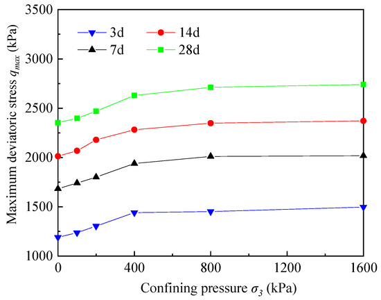 The structure of the cemented soil was very dense and it was difficult for the penetration of water due to the hydrolysis and hydration reaction between the water, soil, and cement. The cemented soil was probably not fully saturated in the experiments and actual engineering project [23,24]. Therefore, the effective stress on the cemented soil increased with confining pressure, and the consolidation process made the maximum deviatoric stress of cemented soil increase when the confining pressure increased from 0 to 400 kPa. This phenomenon was very common in unconsolidated-undrained triaxial tests of cemented soil [25]. The air in the void spaces were highly compressed when higher confining pressure was applied and the solubility of void air in the void water was increased. Therefore, the increase in the maximum deviatoric stress of the cemented soil was small due to the increase in the sample saturation when the confining pressure was between 400 and 1600 kPa. This is consistent with the phenomenon for unsaturated soft clay [26,27].