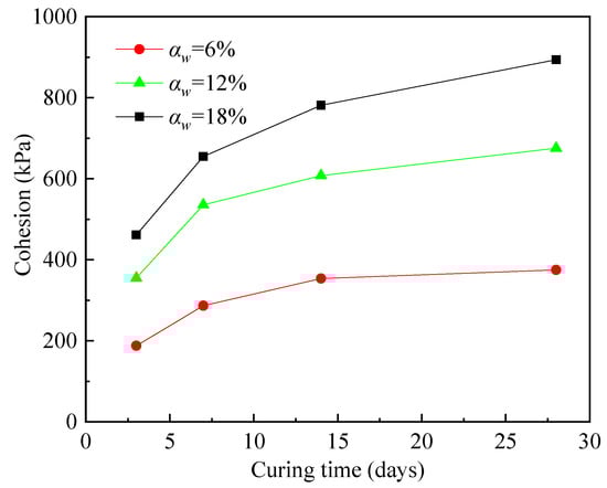 The correlation between the cohesion of the cemented soil and cement content is shown in Figure 13. This figure shows that the cohesion increased stably when the cement content increased. Moreover, the cohesion also increased with the curing time. Figure 13 also shows that when the specimens were cured for 28 days, the cohesions were 375.1 kPa, 675.3 kPa, and 894 kPa when the cement contents were 6%, 12%, and 18%, respectively. The cohesion increased to 894 kPa as the curing time reached 28 days when the cemented content was 18%.