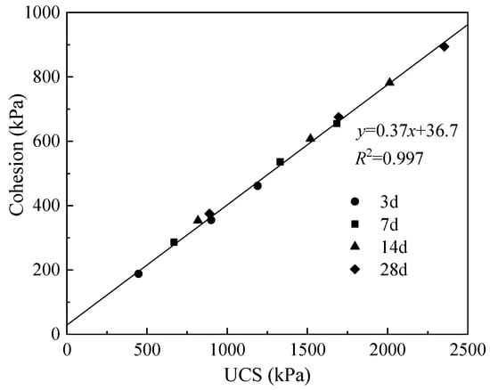 - There was a good linear correlation between the cohesion and UCS of the cemented soil. The UCS of the cemented soil was about 2.38–2.63 times that of the cohesion in the unconsolidated-undrained triaxial tests.