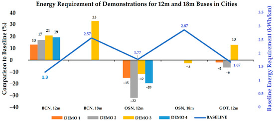 | City, Bus Type and Demo Number | Speed (Mean and maximum) | Baseline Energy Requirement | Energy Savings |