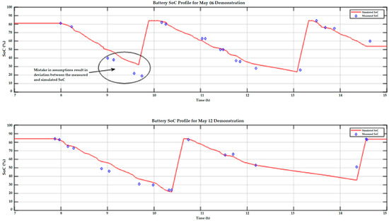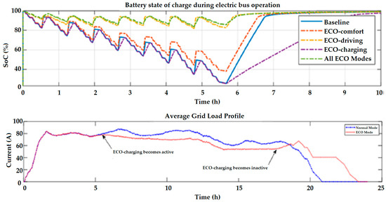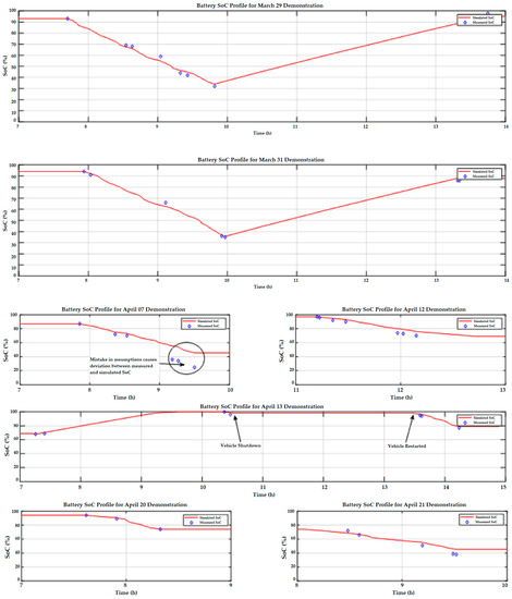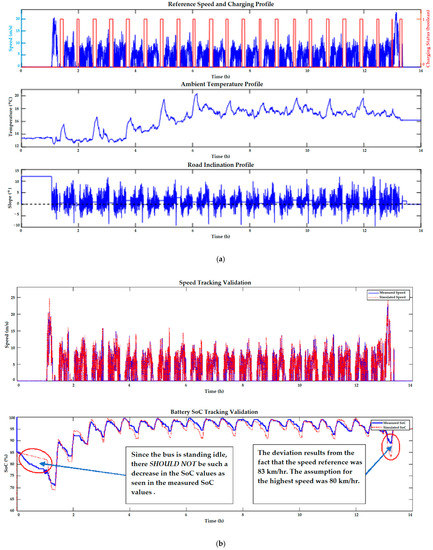 - The passenger load estimation: Passenger load inside the bus is the one aspect that could not be automatically measured and requires manual counting; thus, it is usually ignored. Instead, some simulations involved an intricate passenger model based on the passenger appearance rate at each bus stop as a function of time [12], which is modeled on actual bus traffic data by the CBO. Others use agent-based modeling whereby each passenger is a unique object that has “preferences”, such as drop in point, drop off point, and waiting time [13]. In [14], a cellular automata model is utilized to study behavioral characteristics of bus passengers boarding and alighting behavior. There are also certain cases where a fixed load was assumed within the bus, based on passenger load factor [15], when the passenger load is ancillary to other considerations. The UC simulations carried out in [5] assumed a random passenger profile as a function of time within the bus cabin; however, for this validation, the passenger inside the bus was estimated based on the measured SoC profile.