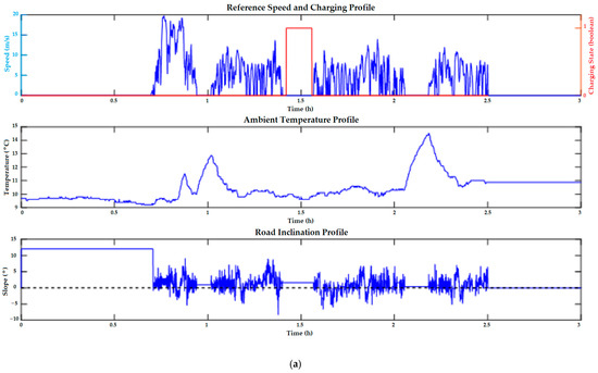 | Passenger load | Only driver initially, full load between 1 h and 4 h, then half load until 13 h, then driver only until end | Driver only | Only driver when idle (i.e., at end of the route or during charging), full load when bus is moving |