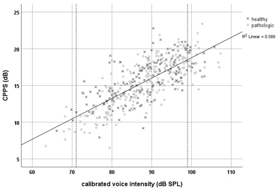 Smoothed Cepstral Peak Prominence (CPPS) with reference to sound pressure level (SPL) (@10 cm distance) in 58 voice-disordered and 58 age-matched, vocally healthy women. All phonated at individually “soft”, “comfortable”, and “loud” intensity levels. In this sample, “comfortable” phonation spanned a total range of 71–99 dB SPL (in between dashed lines) (Figure: own image, derived from [42,43]).
