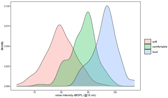 Sound pressure level (SPL) distribution (@10 cm) in “soft”, “comfortable”, and “loud” phonations of 58 women with voice disorders and 58 age-matched, vocally healthy controls. The area under each curve indicates the probability (termed density) that a value will fall within the indicated interval. (Figure: own image, derived from [42,43]).