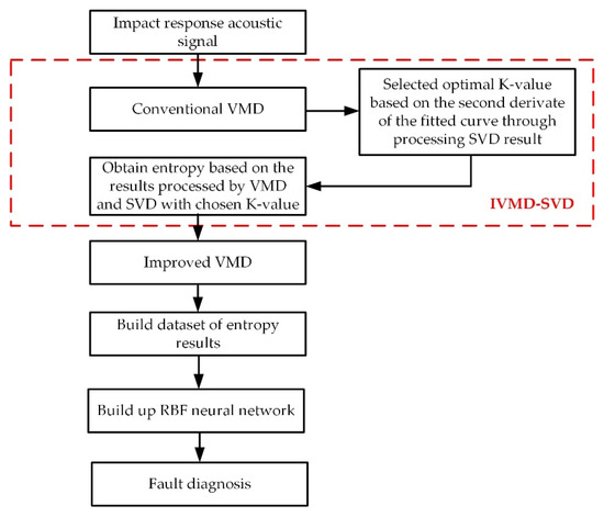 The proposed IVMD–SVD method uses an algorithm to automatically select the number of modes (K-values) to be used in the decomposition of the impact response signal. The result, decomposed by the selected modes, is processed to obtain the Shannon entropy, which is then used in further analysis.