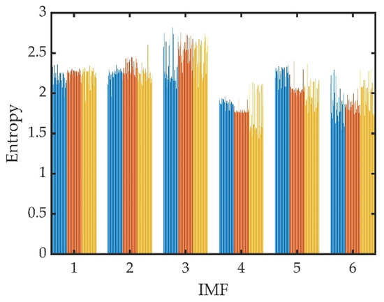 The result of Shannon entropy was then obtained using IVMD–SVD with the selected K-value. The process was applied to 30 measurements of each of the three rail conditions presented in Figure 6. The blue, red, and yellow bars represent healthy, 0.1 mm, and 0.75 mm depths of fault, respectively.