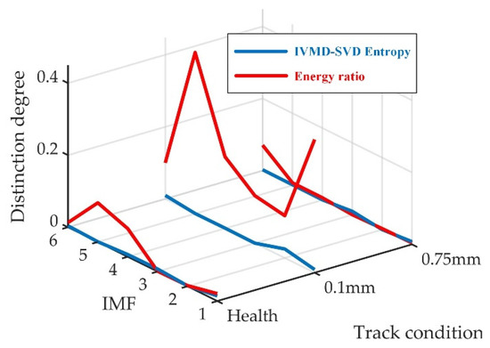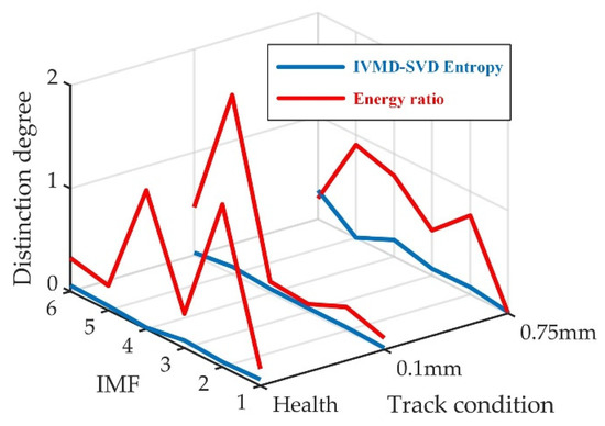 The distinction degree results from IVMD–SVD entropy and energy ratio are presented in Figure 10.