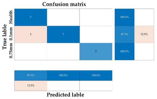 The two figures show that, for the selected K-value, both healthy and faulty rails could be classified with over 94% accuracy. This suggested that acoustic impact response signals obtained from different rail conditions could be effectively classified using the proposed IVMD–SVD method. All healthy and all 0.75 mm samples were identified correctly. One 0.1 mm sample (12.5%) was incorrectly identified as healthy. However, this was considered to be due to the small size of the defect, which might also have been too small to diagnose using existing approaches.
