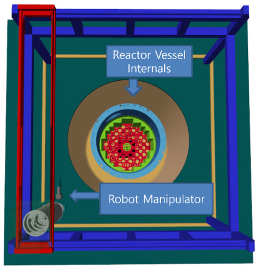 A nuclear plant is shown in Figure 1. The main purpose of the system is to cut the reactor vessel internals (RVI) remotely using a three dimensional (3D) haptic device. The six DOF robot manipulator has five revolute joints and one prismatic joint. The proposed technique is carried out on five DOF robots (revolute joints) while cutting inside RVI. The obstacle can be the wall of the RVI or any cutting material on its way. The five DOF robot manipulators go into the round shape reactor vessel internally (RVI) for cutting purposes. The computer-aided design (CAD) of the robot can be seen in Figure 2 [22].